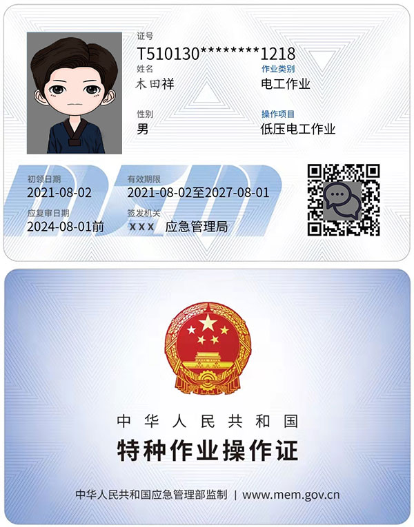 1、電工證便是特種行業(yè)操作證,由應(yīng)急管理廳(原安監(jiān)局)頒布、帶IC卡,卡內(nèi)有相關(guān)持證人的資料,全國通用。變革后有電子證、與實(shí)體證書具有平等效益。證書每3年復(fù)審一次,六年一換證,未經(jīng)年審的將會(huì)報(bào)廢。